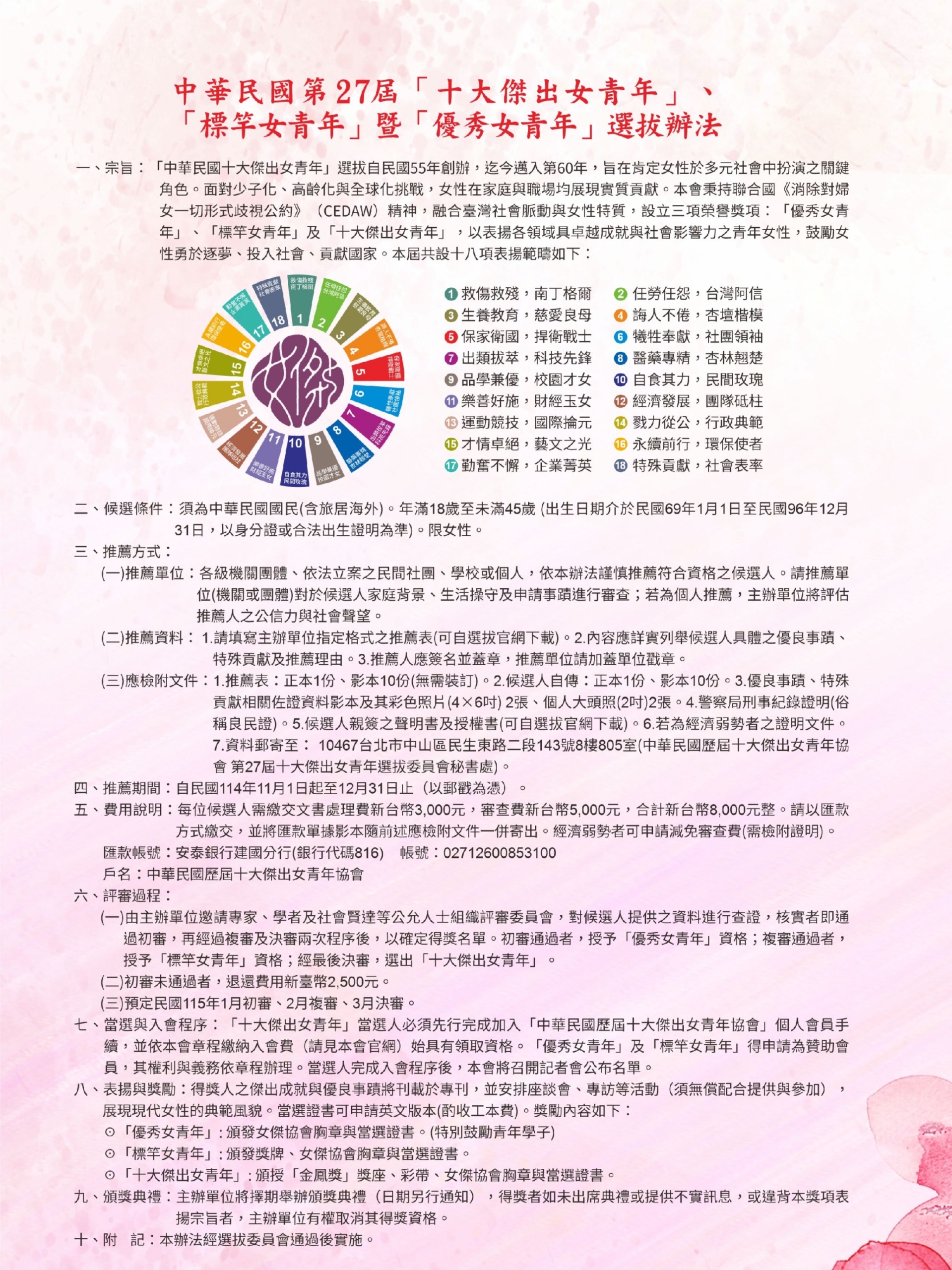 轉知社團法人中華民國歷屆十大傑出女青年協會舉辦第27屆「十大傑出女青年」、 「標竿女青年」暨「優秀女青年」選拔活動事宜