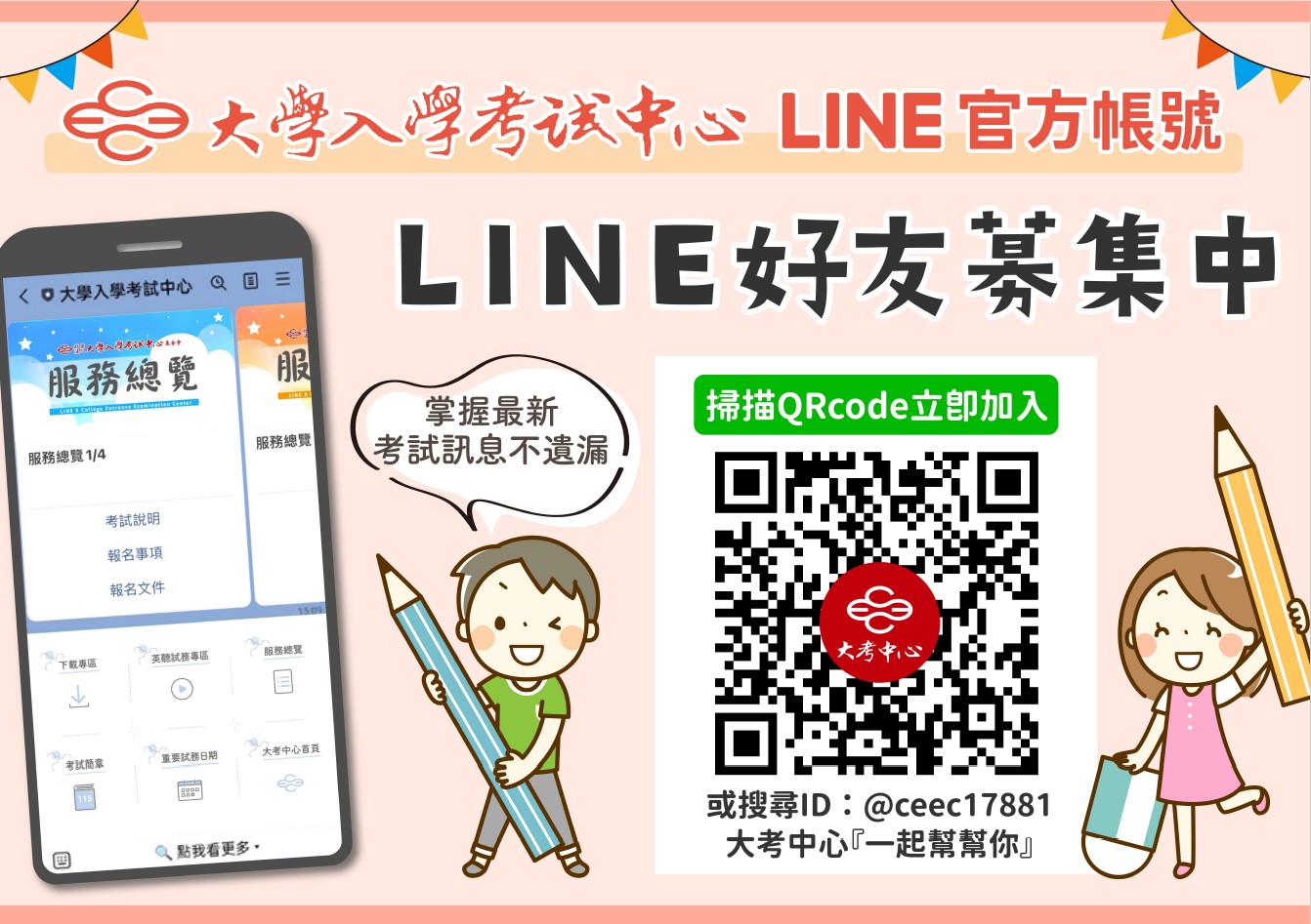 三、為使考生及師長即時掌握最新考試資訊,鼓勵加入大考中心 LINE 官方帳號;網址:https://page.line.me/415tatkb?openQrModal=true,或掃描下方QR Code。