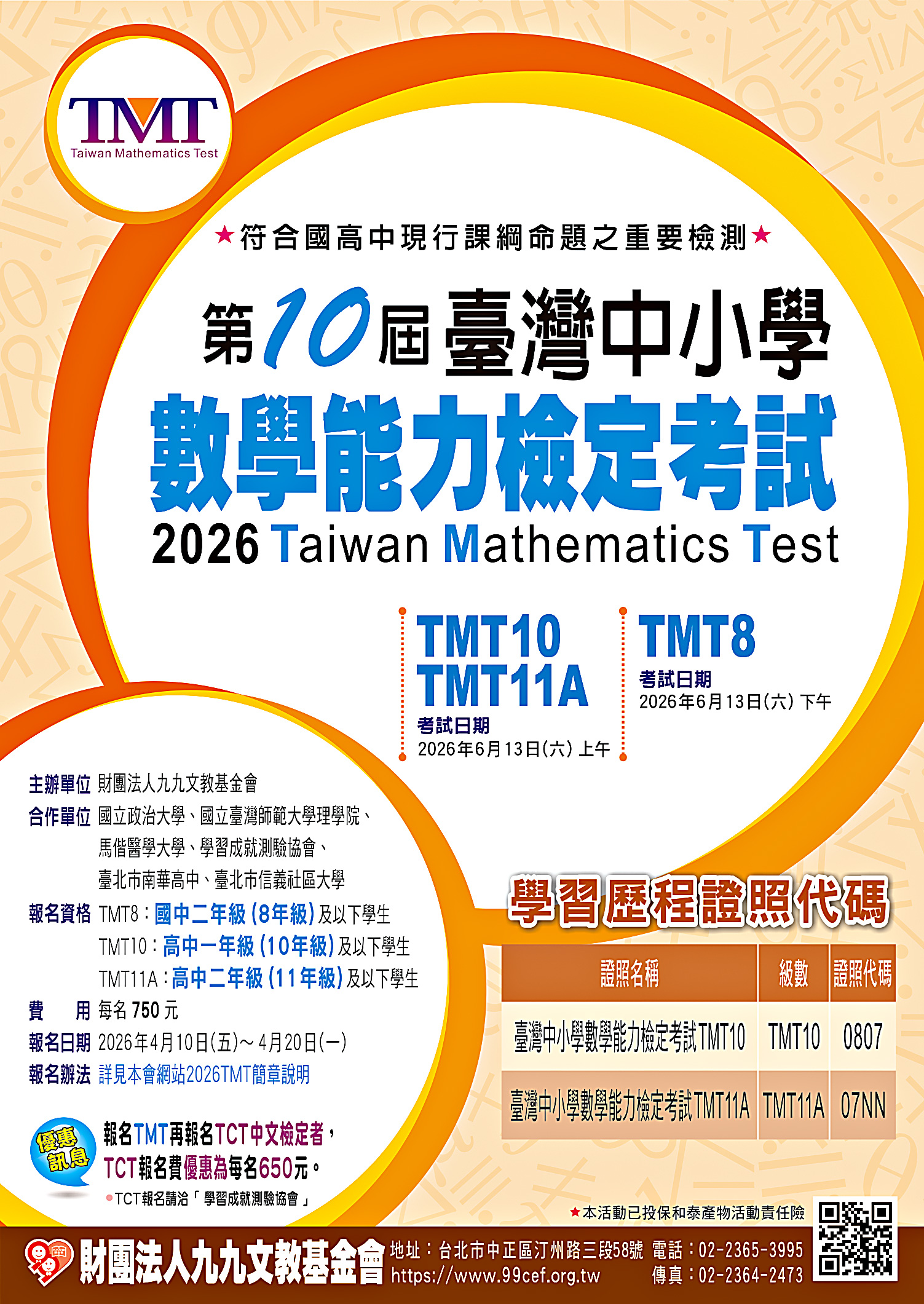 財團法人九九文教基金會訂於民國115年6月13日(星期六)舉辦第十屆臺灣中小學數學能力檢定考試(Taiwan Mathematics Test, TMT)